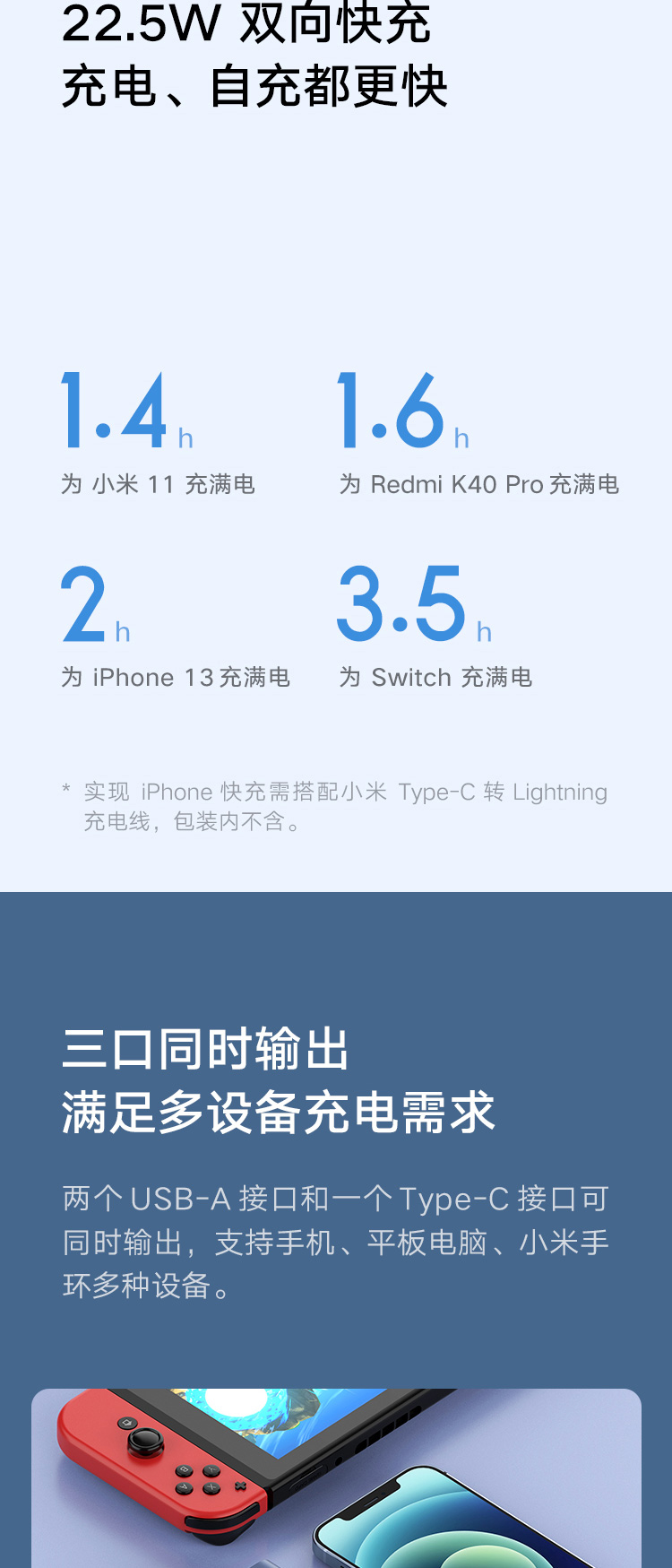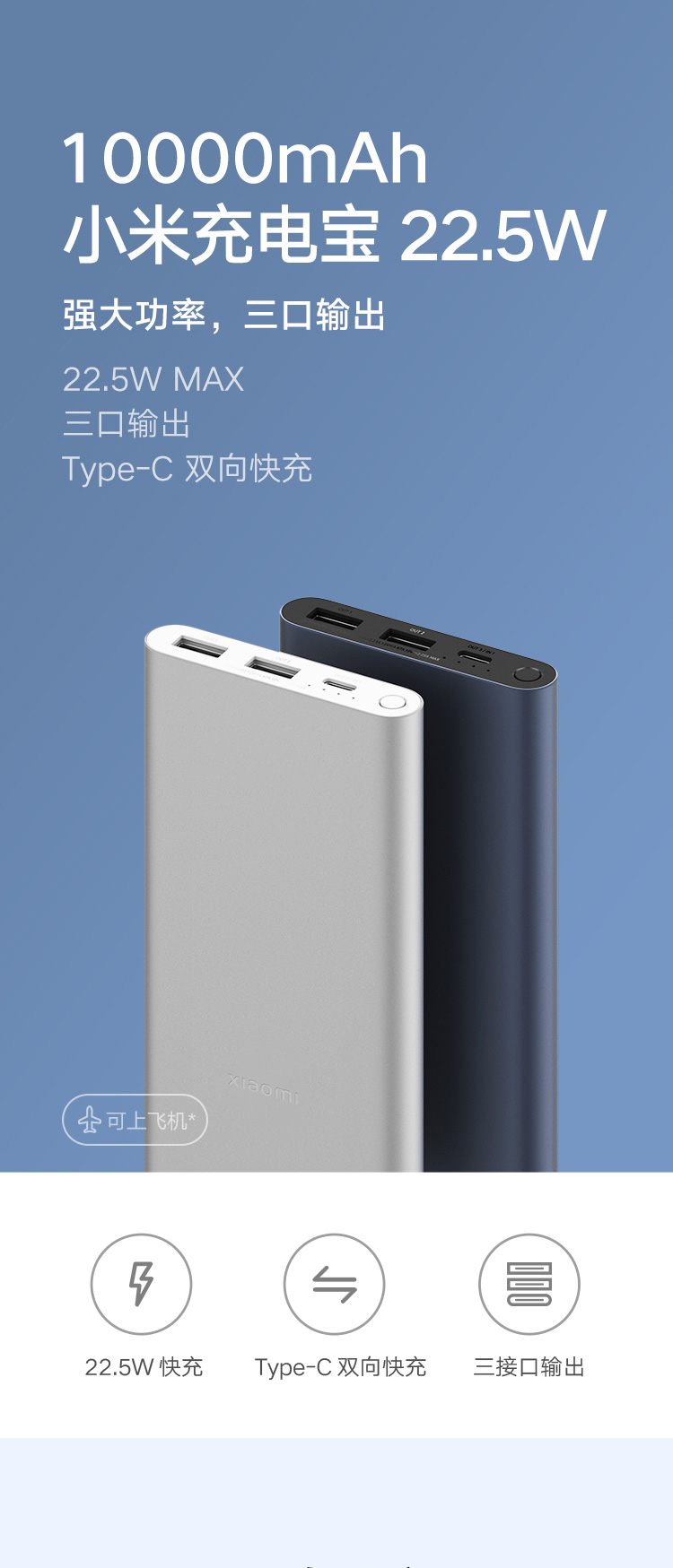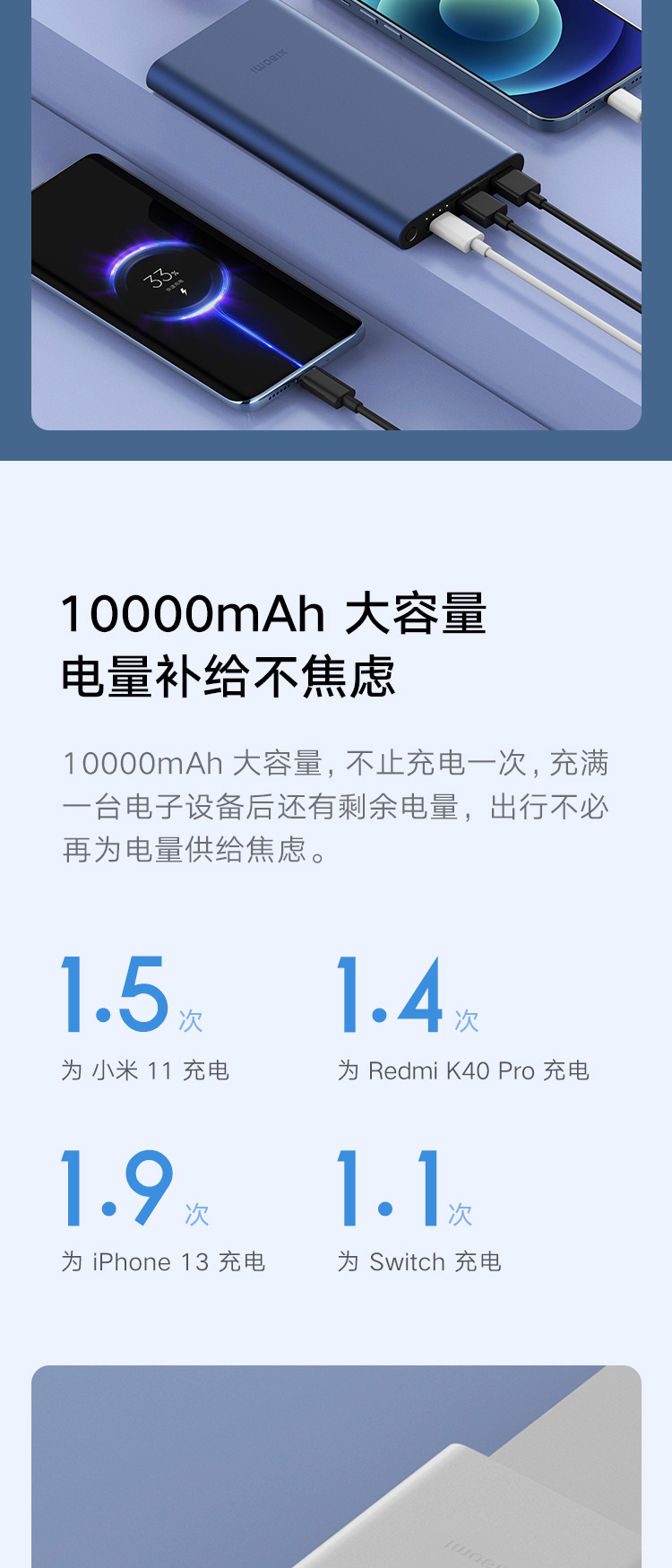 商品名称:小米(MI)充电宝10000毫安 22.5W快充 原装移动电源 超薄小巧便携大容量 支持PD快充苹果20W安卓小米华为