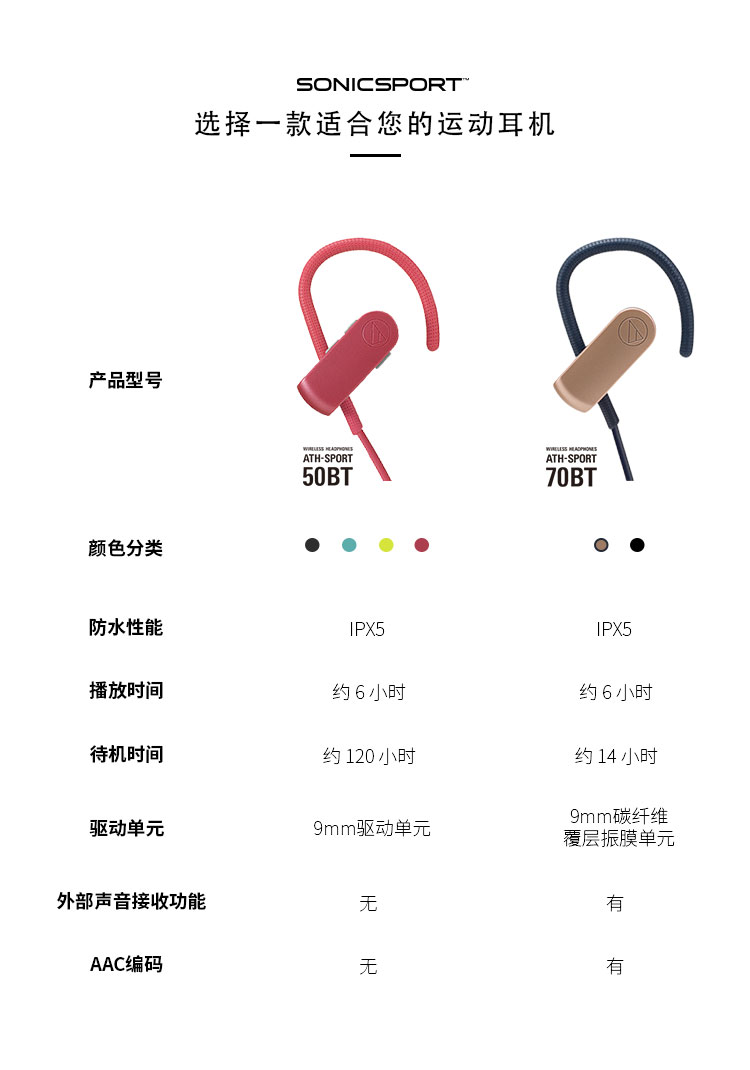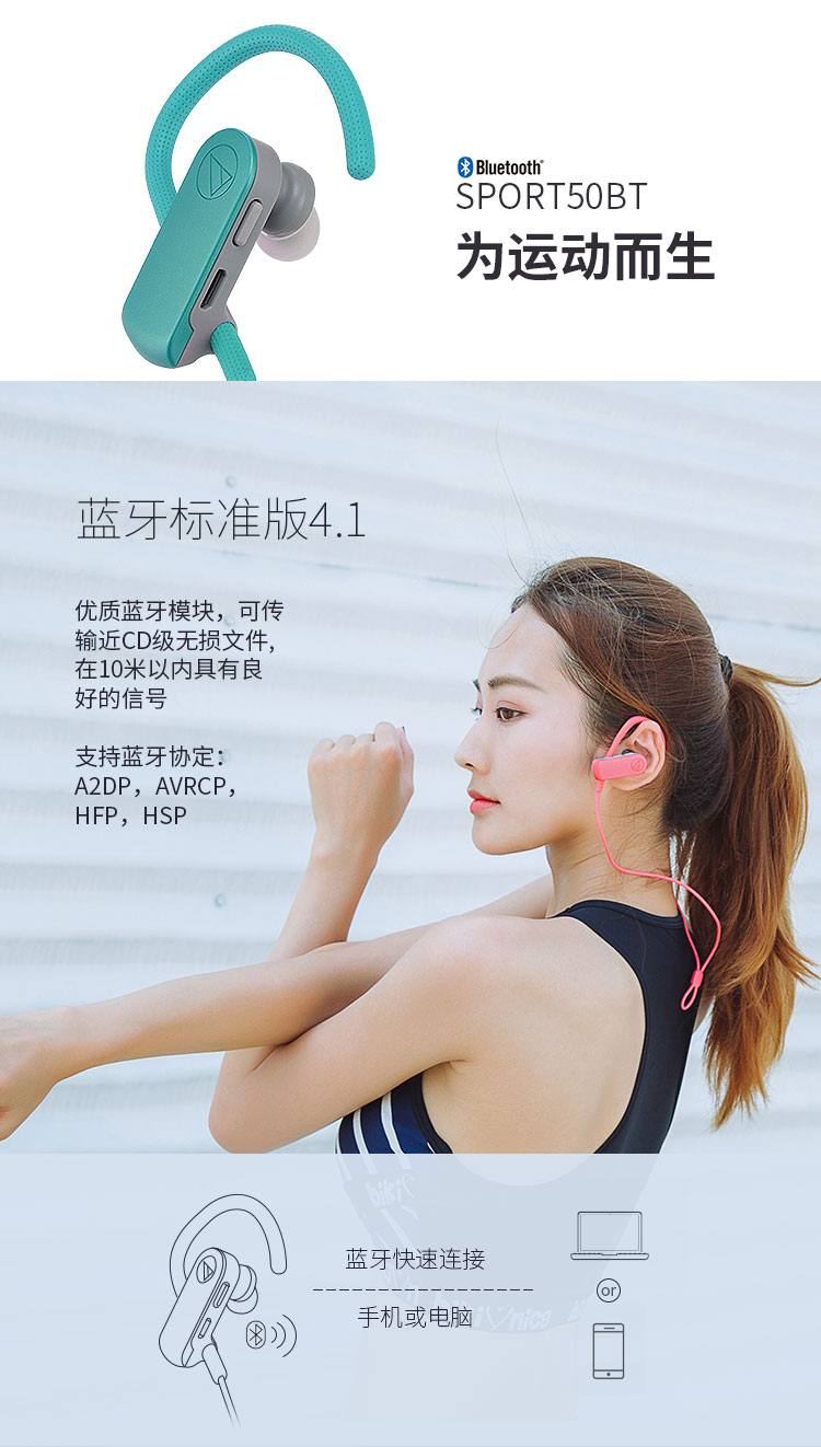 商品名称:铁三角(audio-technica) SPORT50BT 入耳式蓝牙无线耳麦 IPX5级防水 手机耳机 运动跑步 粉色