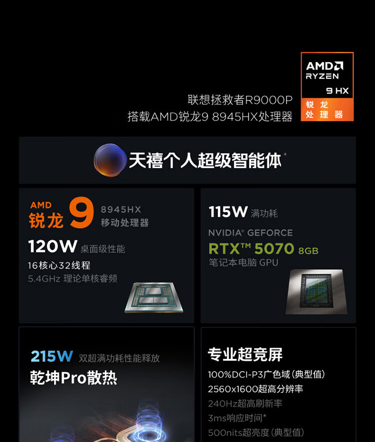 商品名称:联想(Lenovo)拯救者R9000P 2025 16英寸电竞游戏笔记本电脑(锐龙R9 8945HX 32G 1T RTX5070 2.5K 240Hz)白色
